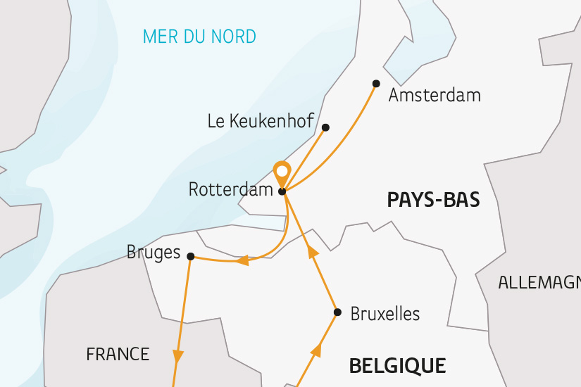 entrée en Belgique et route jusqu'à Bruxelles. Visite guidée panoramique de la capitale belge : la célèbre Grand-Place, les institutions européennes, l'Atomium... Déjeuner puis route par Anvers, entrée aux Pays-Bas. Dîner nuit à Rotterdam.