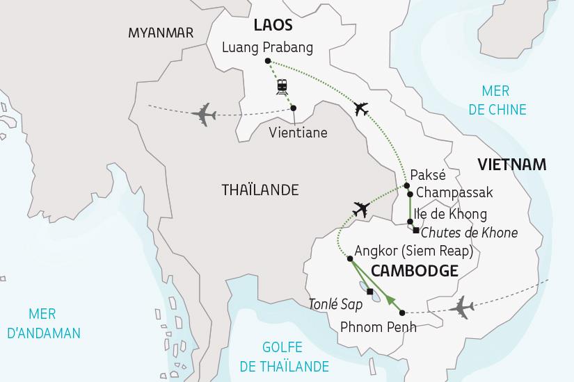 Phnom Penh, Angkor (Siem Reap), Paksé, île de Khong, Luang Prabang, Vientiane